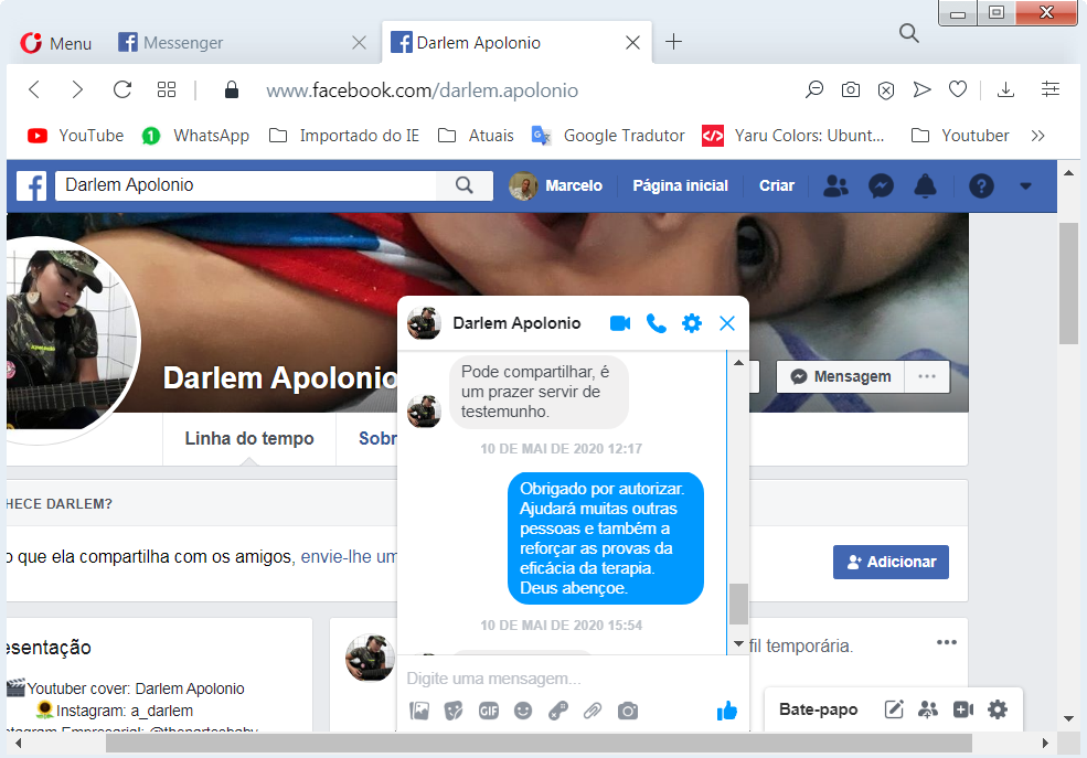 Darlem autorizou a publicação do relato conforme mostram o diálogo e a imagem abaixo.